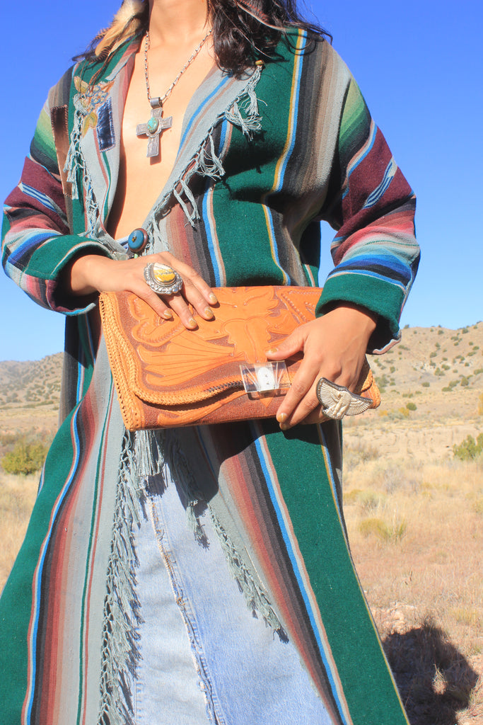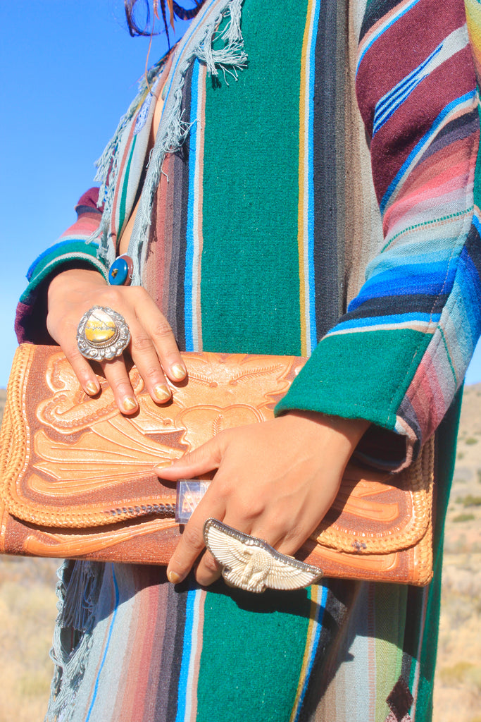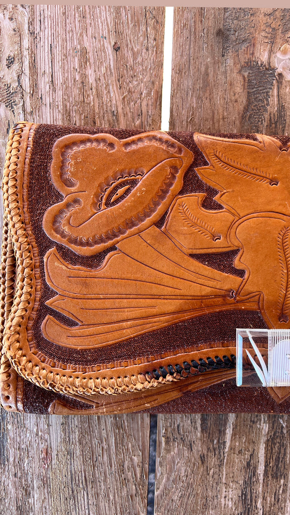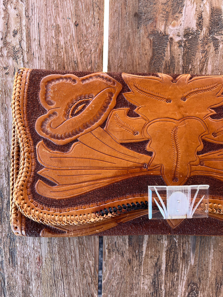 1940s Mexican Hand Tooled Leather Clutch with Bakelite Clasp