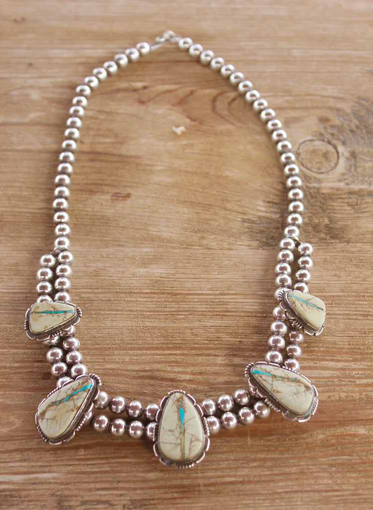 I have heard many opinions on what this piece actually is but it seems to be the general consensus is that it is very fine inlay of turquoise in White Buffalo stones. It is stunning and unique.