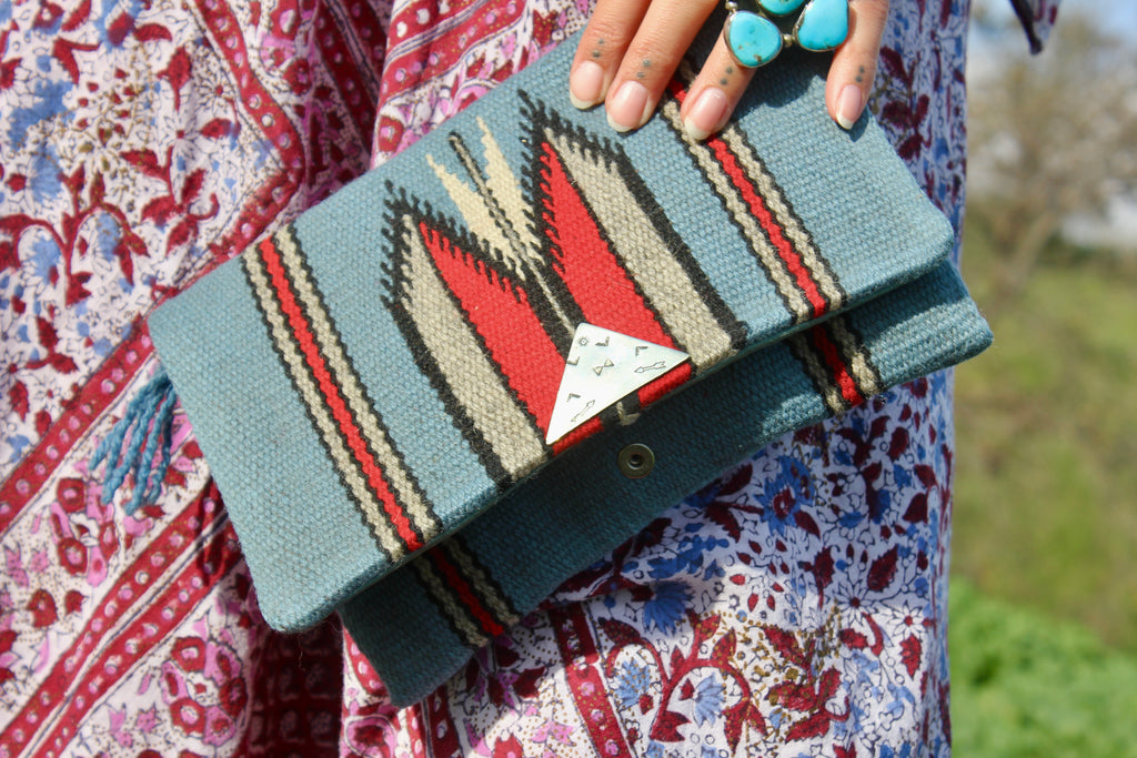 The Chimayo woven pieces to include the clutches each have their own story and is a highly sought out collective item.