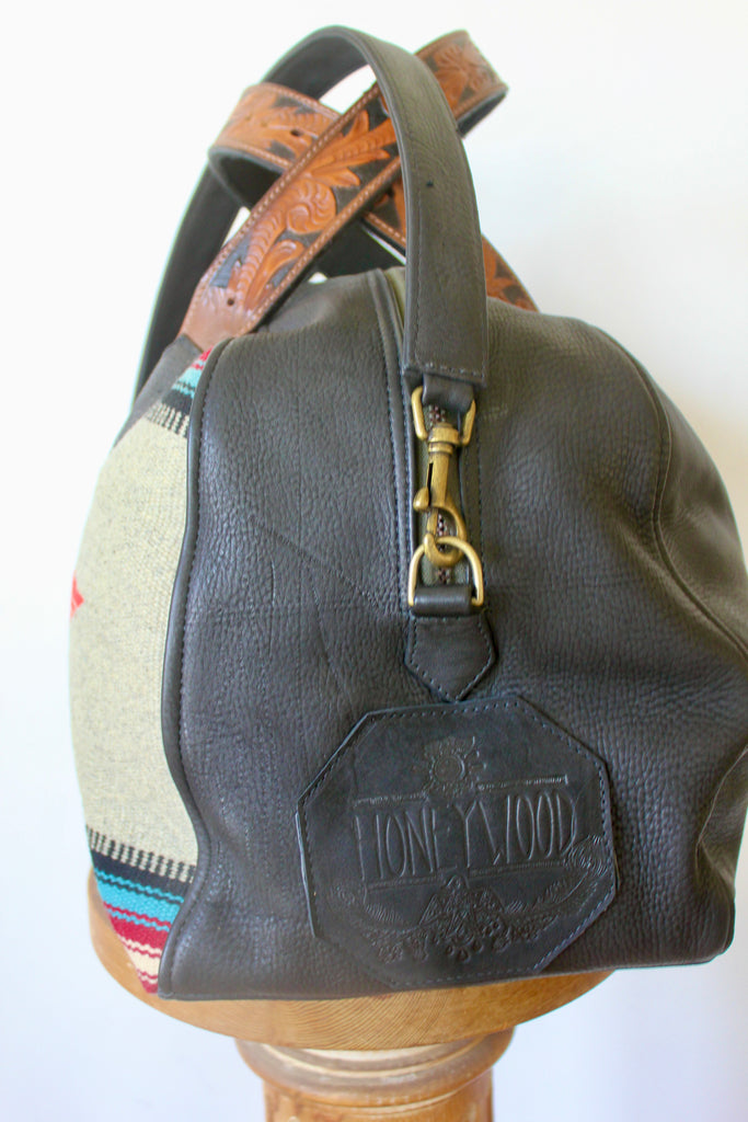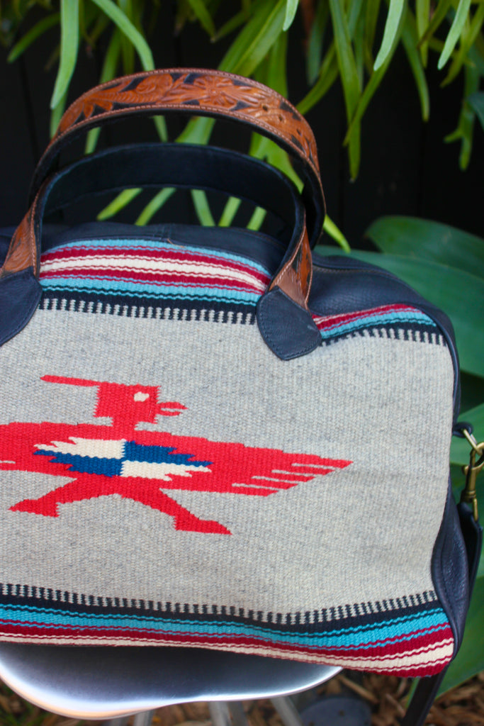 This specific Honeywood Overnighter Bag has a Very Collectible Mid-Century Hand Woven Chimayo Textile in the Design of a Thunderbird! This is a great Uni-sex bag. LOVE It!