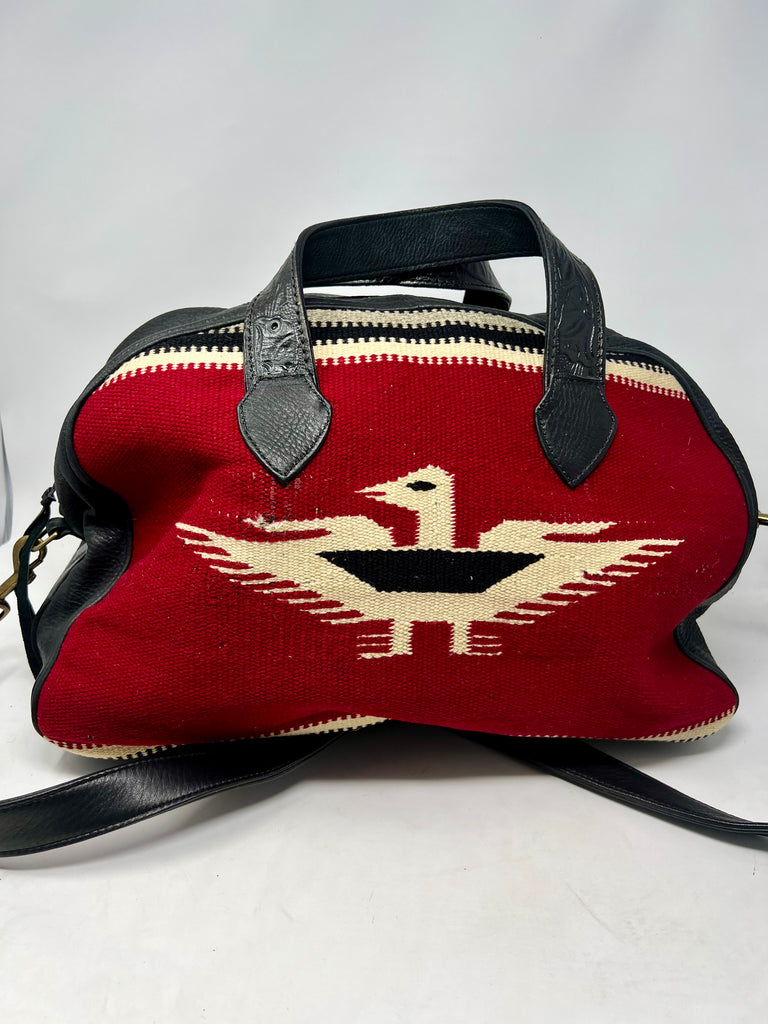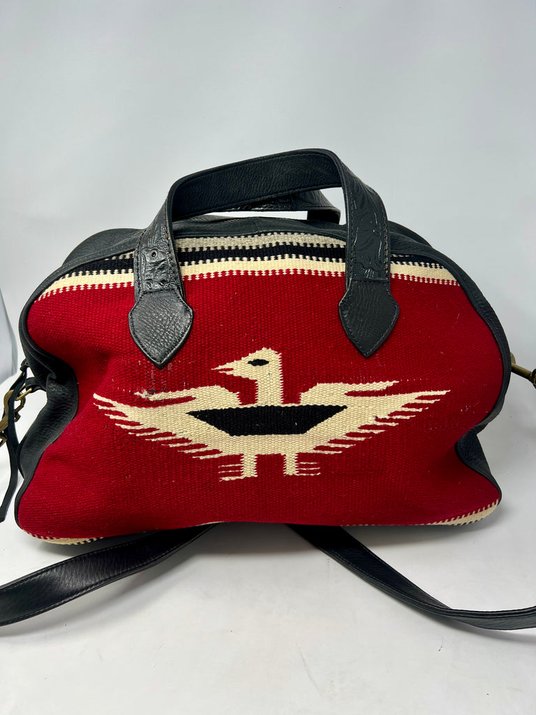 This specific Honeywood Overnighter Bag has a Very Collectible Mid-Century Hand Woven Chimayo Textile in the Design of a Thunderbird! This is a great Uni-sex bag. LOVE It!