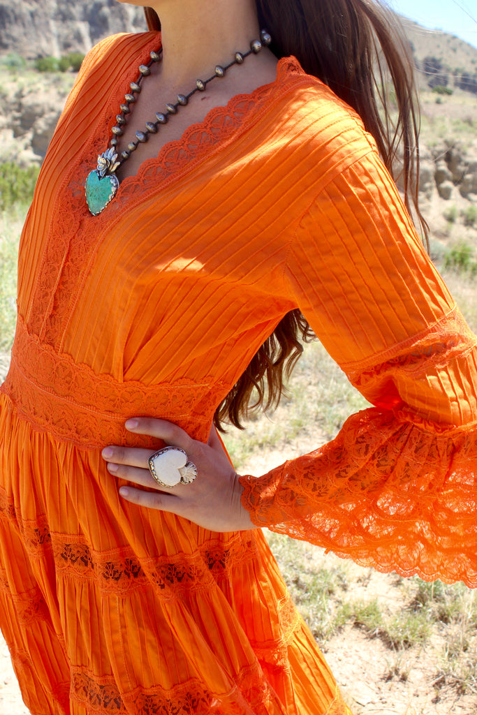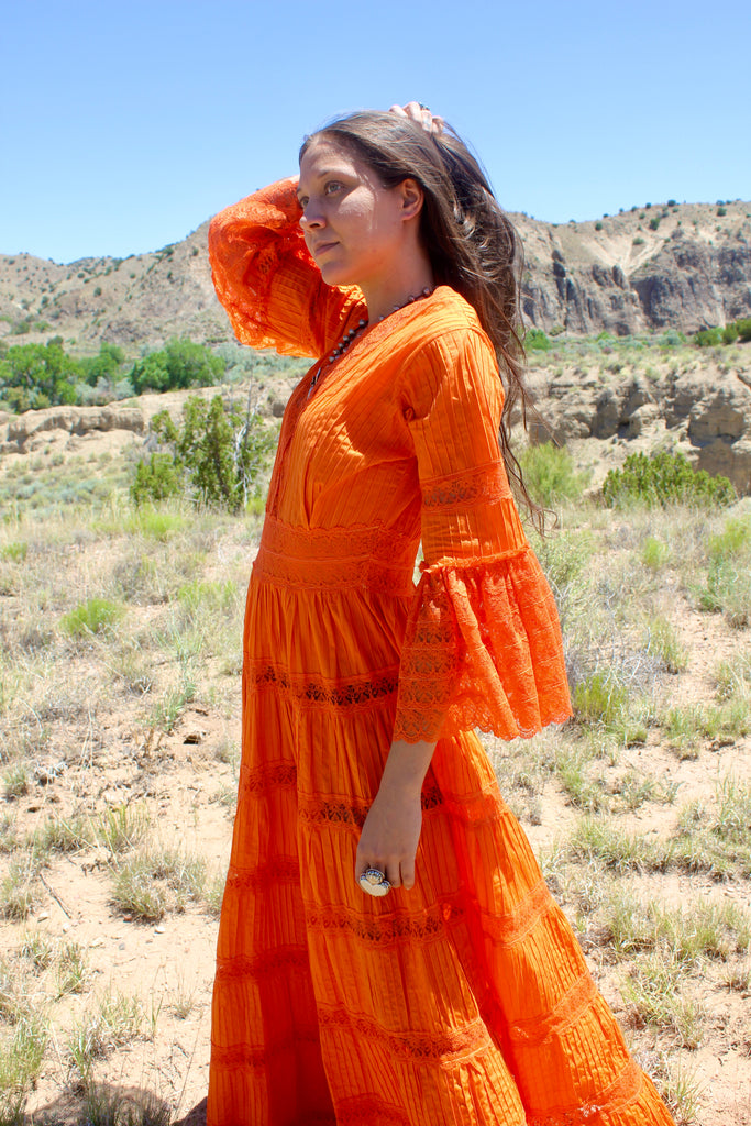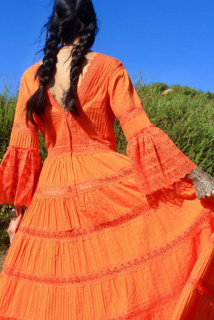 Tangerine Dream" Festive and Vibrant Vintage Mexican Pintucked Maxi Dress