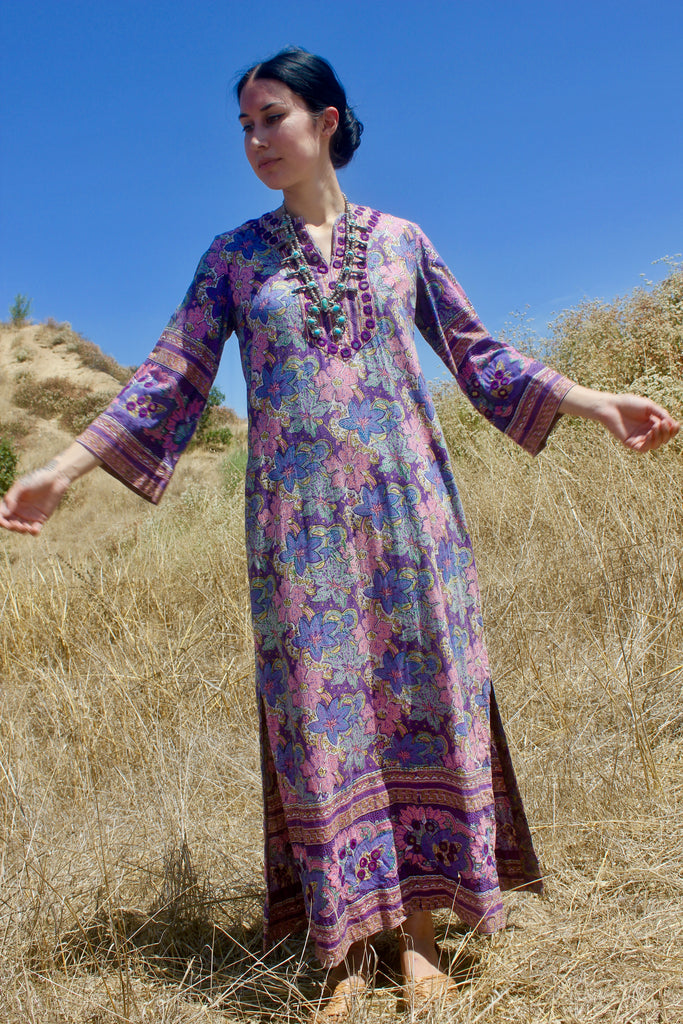 "The Bohemian Hostess" 1970s Block Print Mirrored Maxi Dress