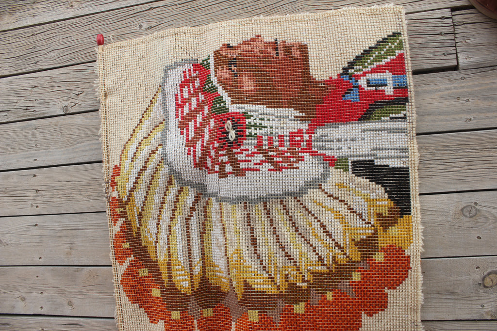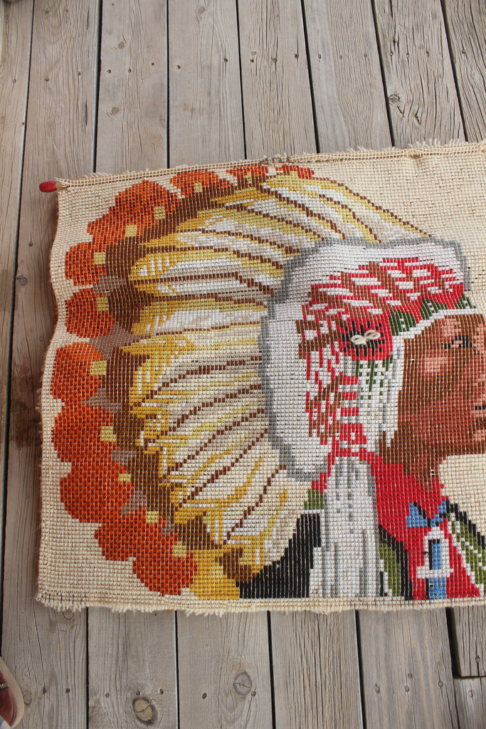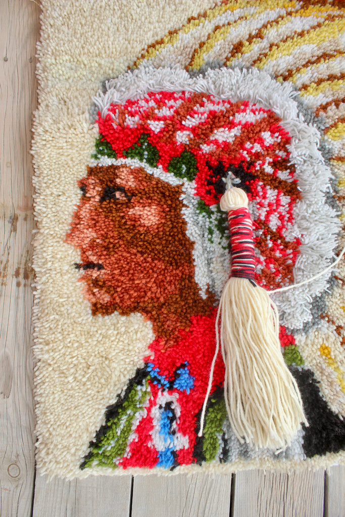 Vintage 1970s Indian Chief Hook Rug Wall Art