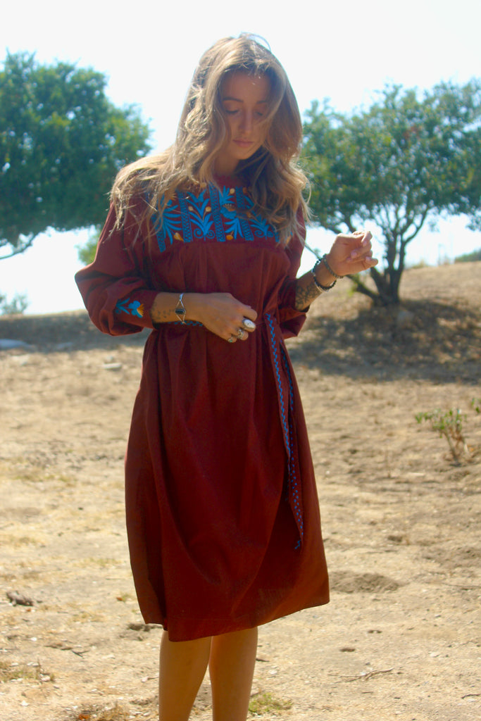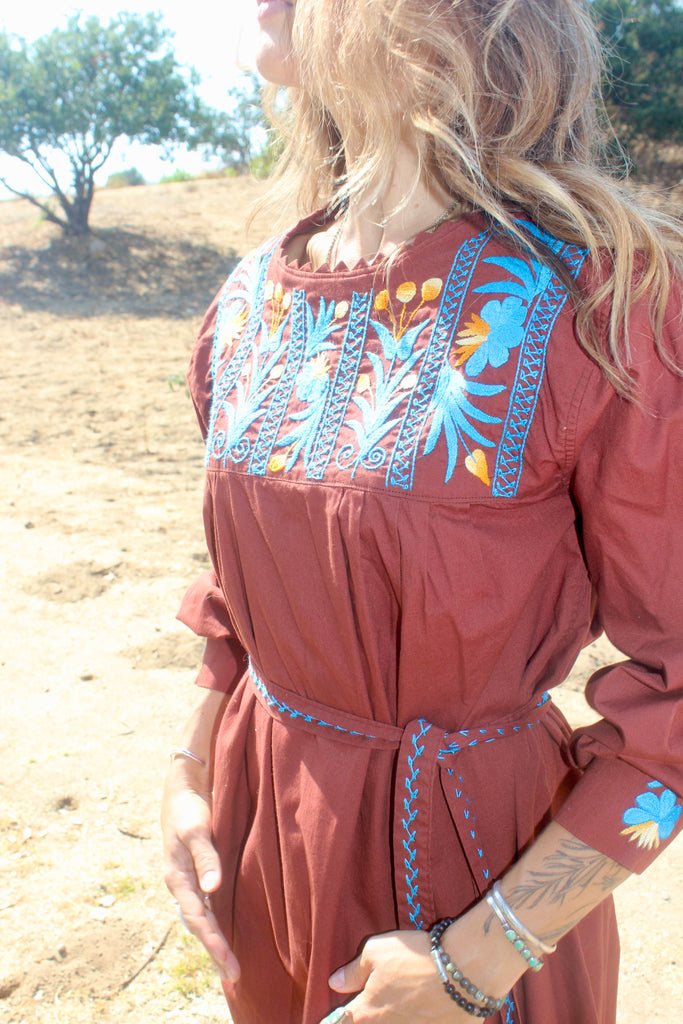 "Chocolate & Turquoise" Vintage Hand Embroidered Artisan Made Mexican Dress