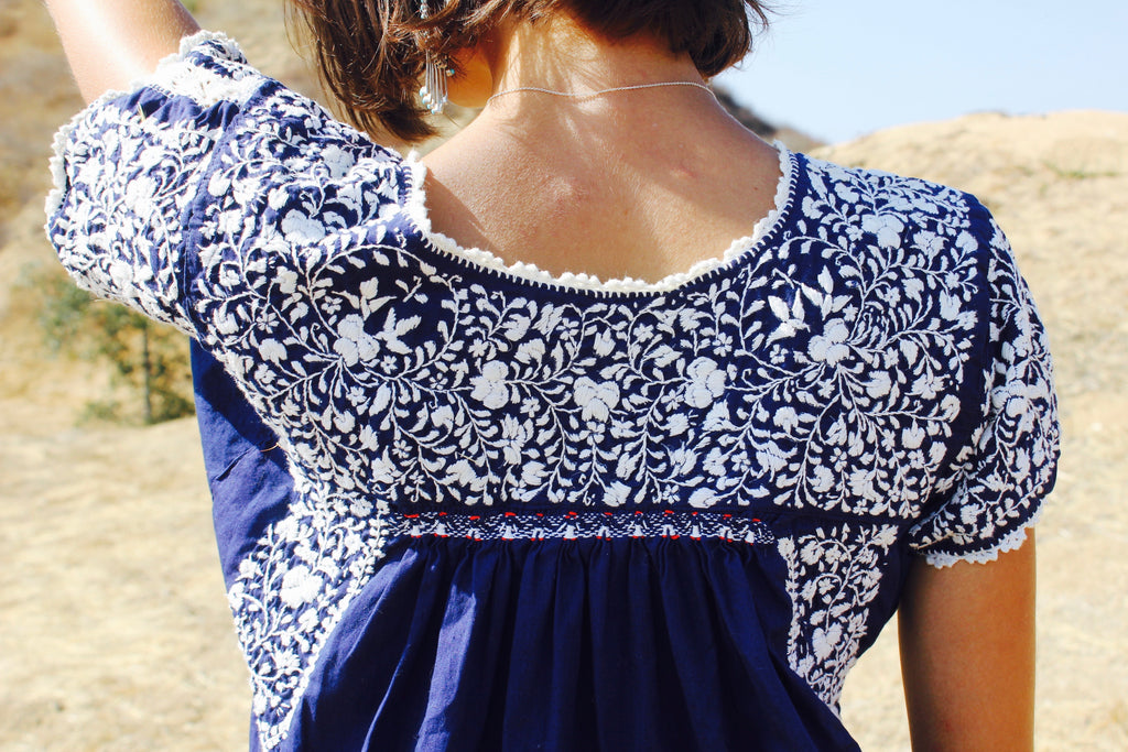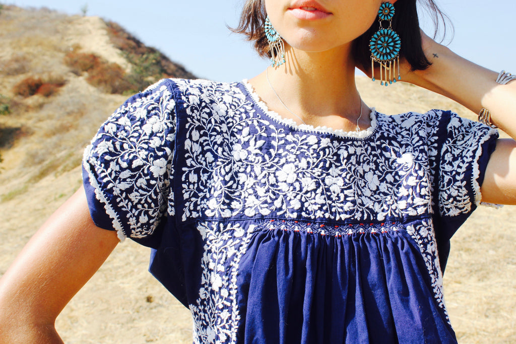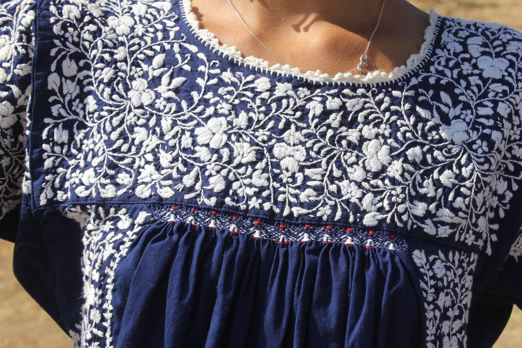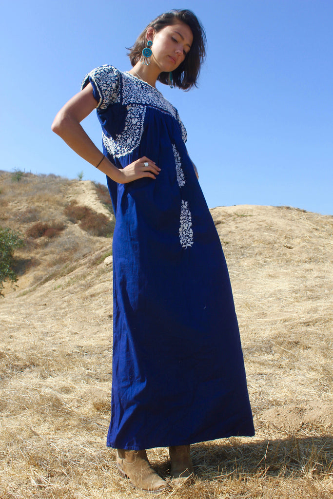 1970s Classic Navy and White Hand Embroidered Oaxacan Maxi Dress