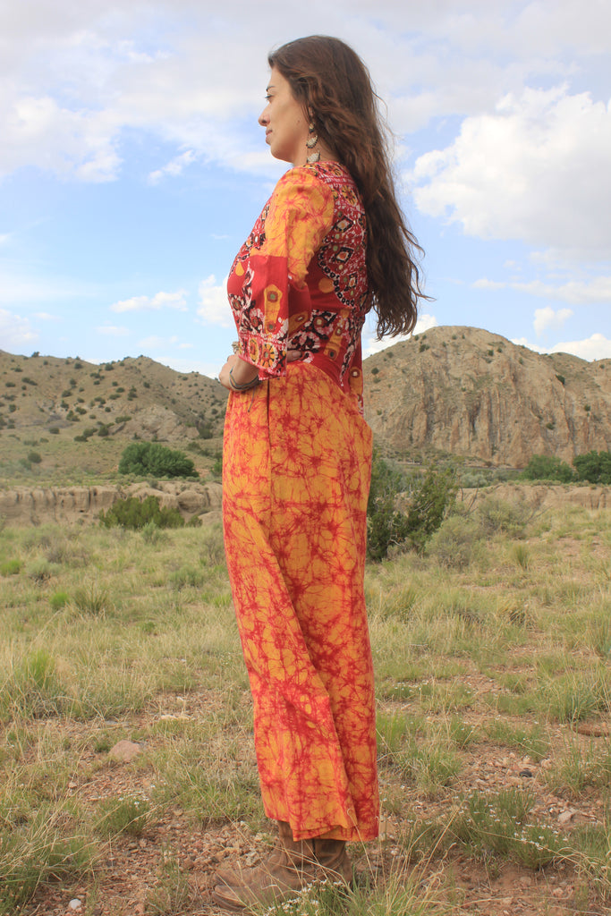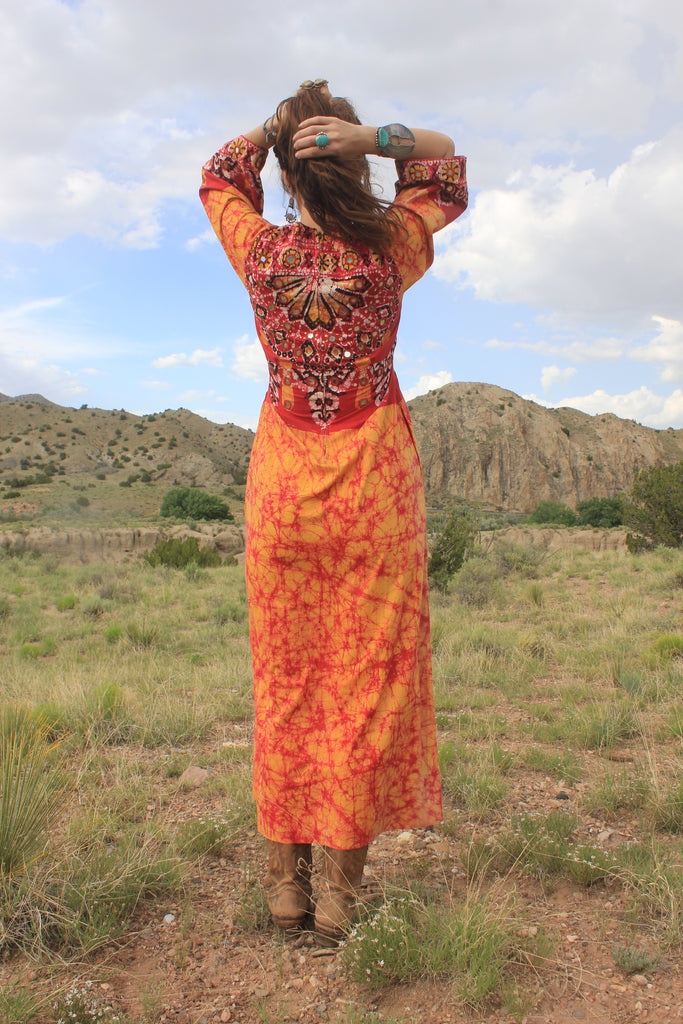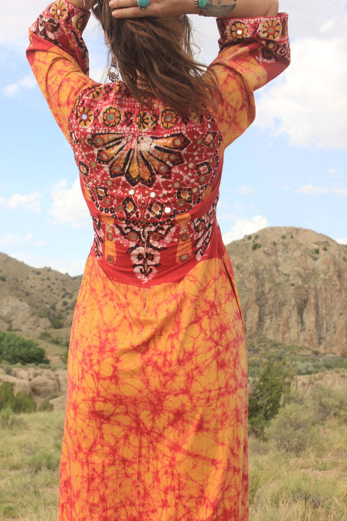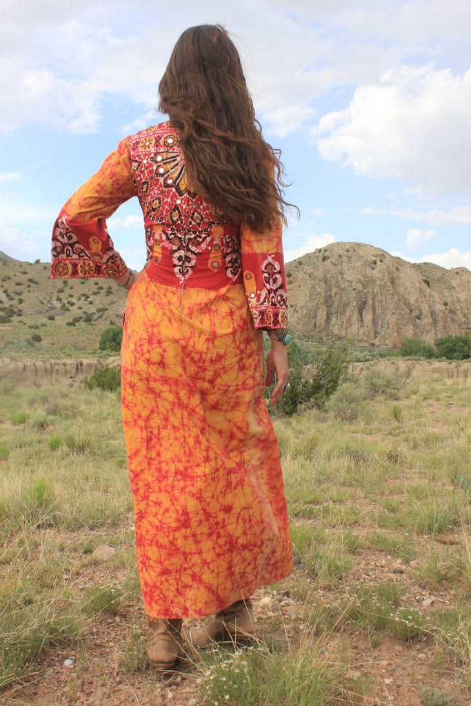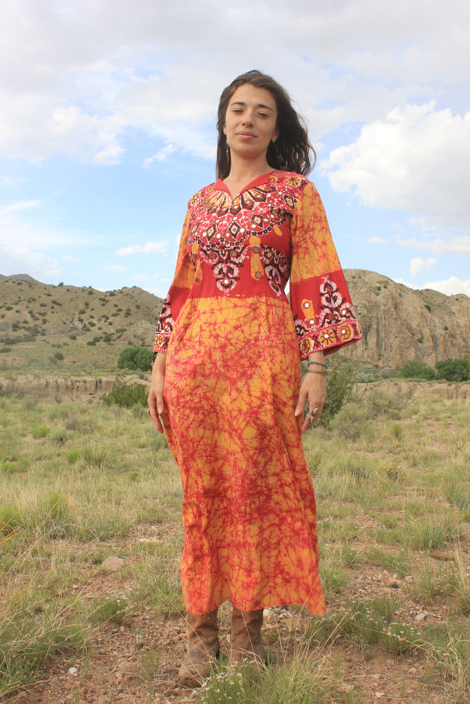 1970s Ramona Rull Batik Maxi Dress with hand embroidered mirrors