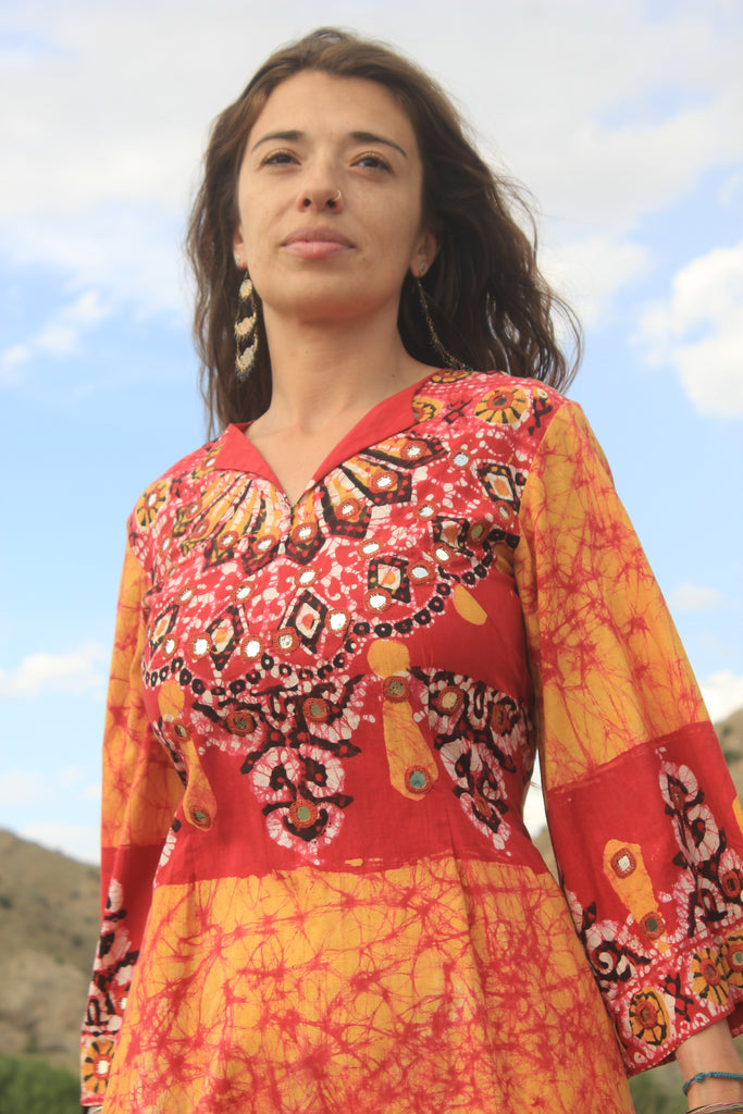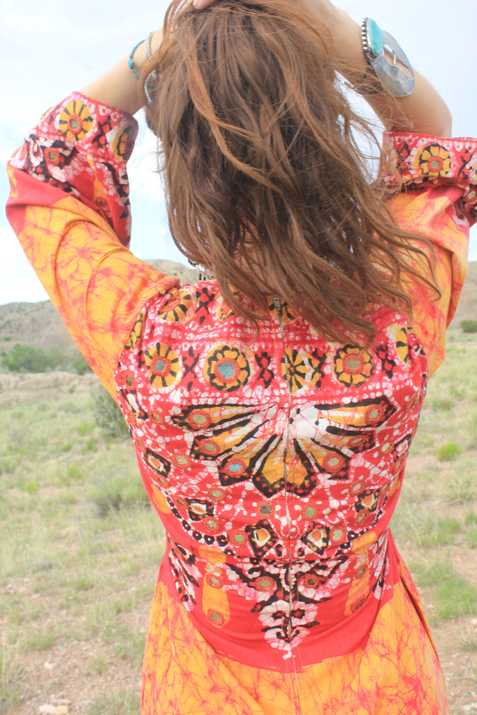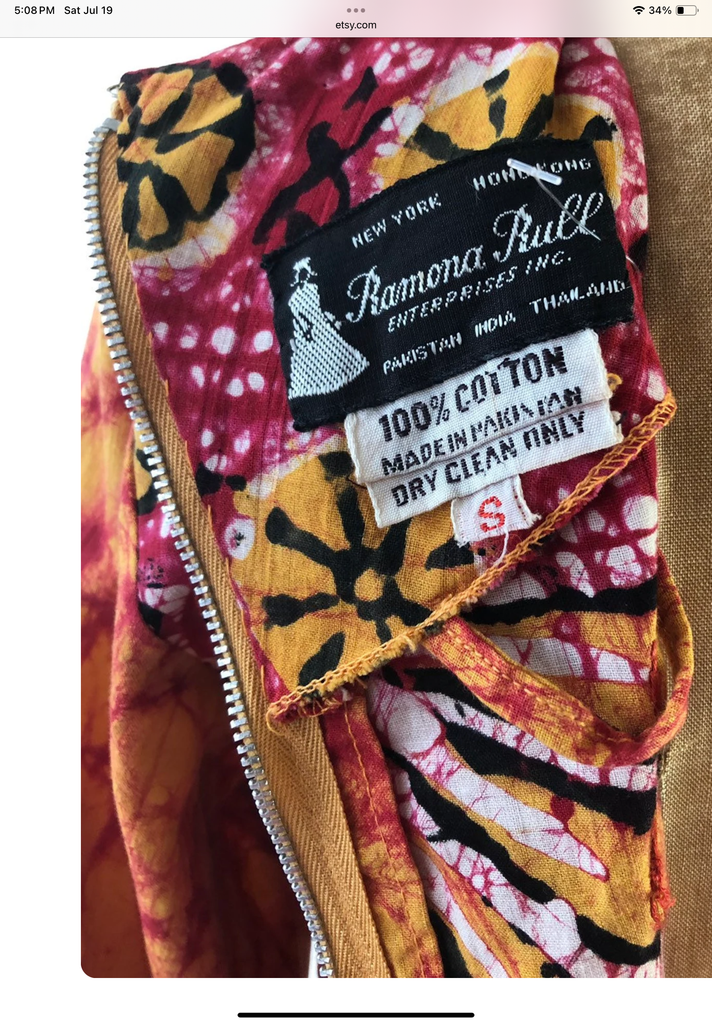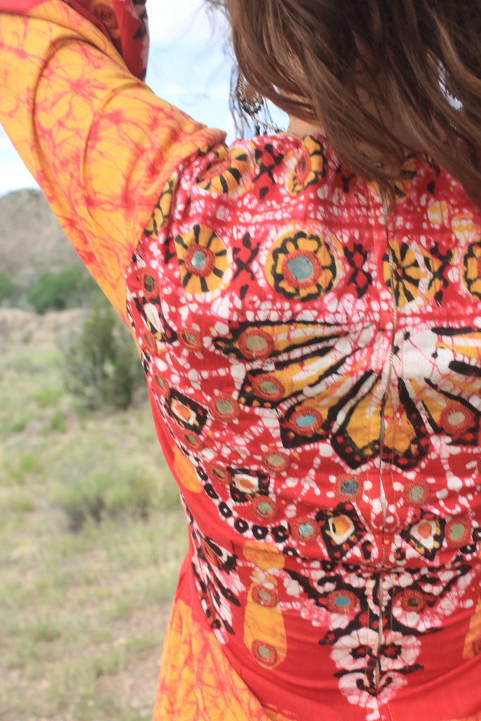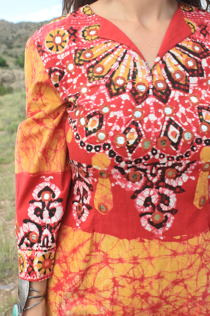 1970s Ramona Rull Batik Maxi Dress with hand embroidered mirrors