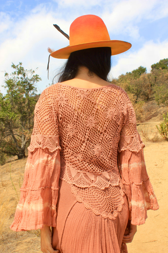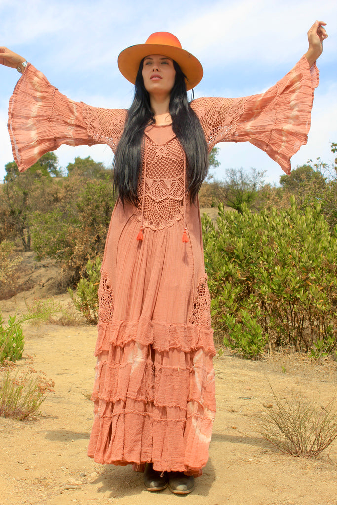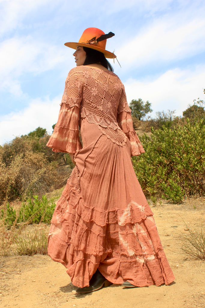 A Honeywood Exclusive Handmade Antique Crochet and Cotton Gauze Maxi Dress Desert Salmon Medium/Large