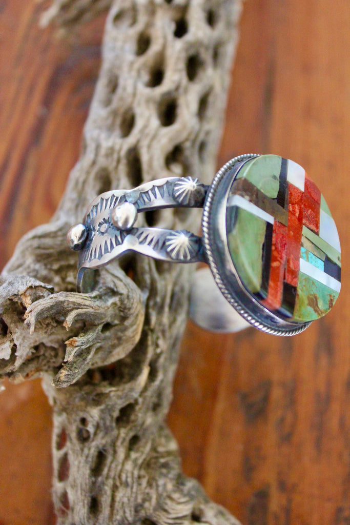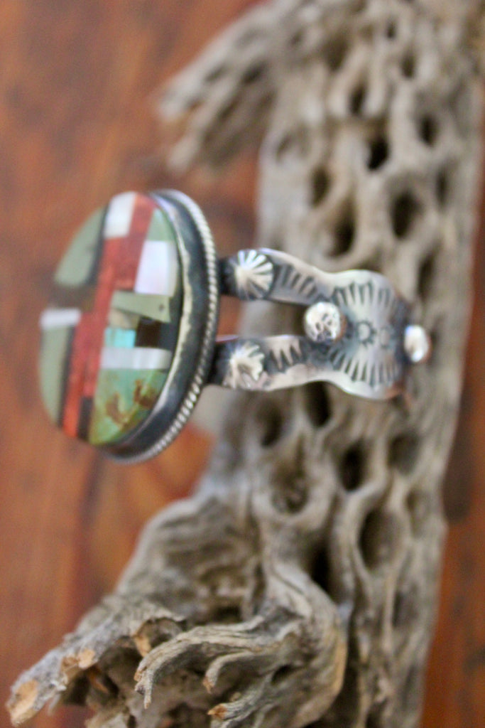 "Chimney Butte" Sterling Navajo Inlay Cuff Turquoise Spiny Oyster etc