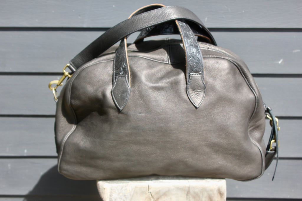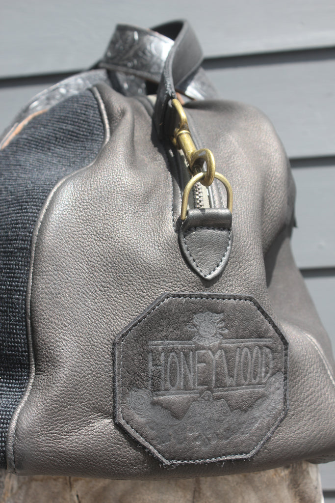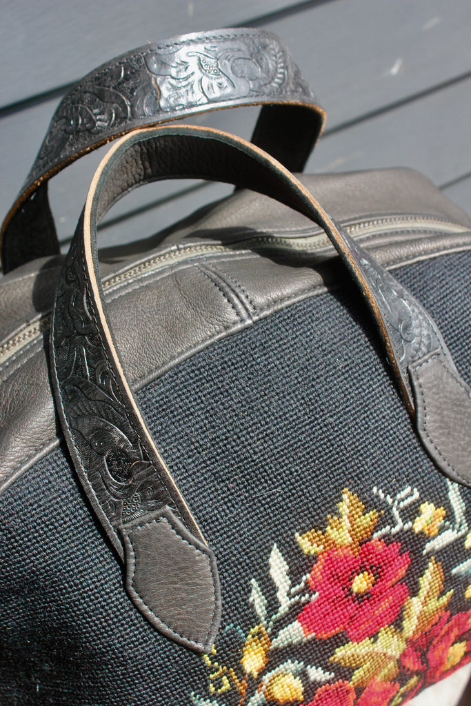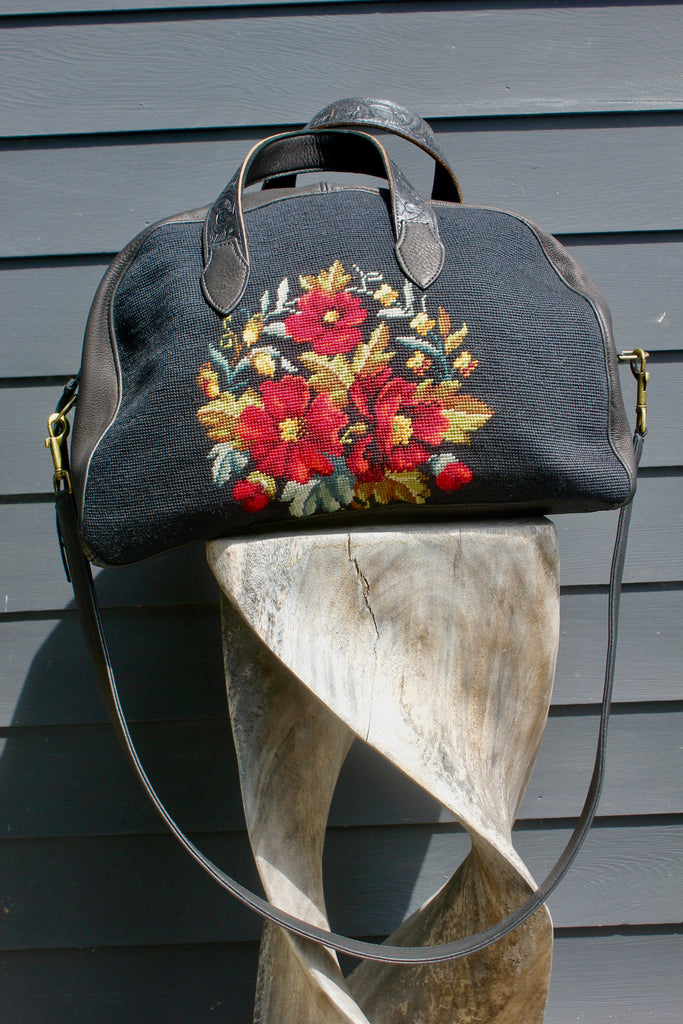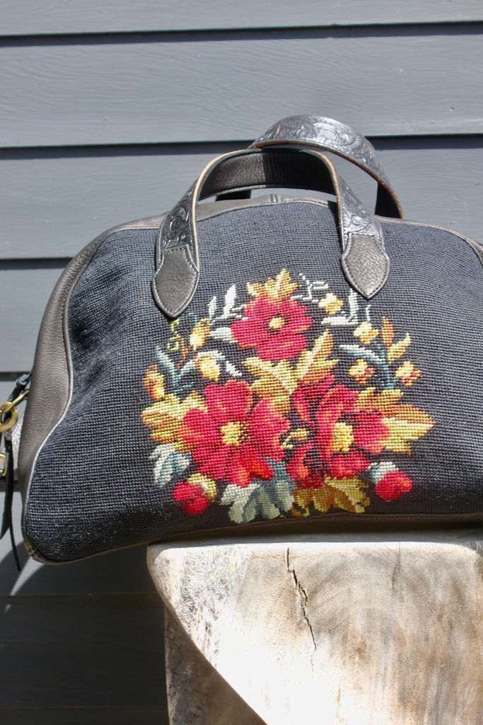 Honeywood Original Antique Poppy Needlepoint Overnighter Bag Elk Hide