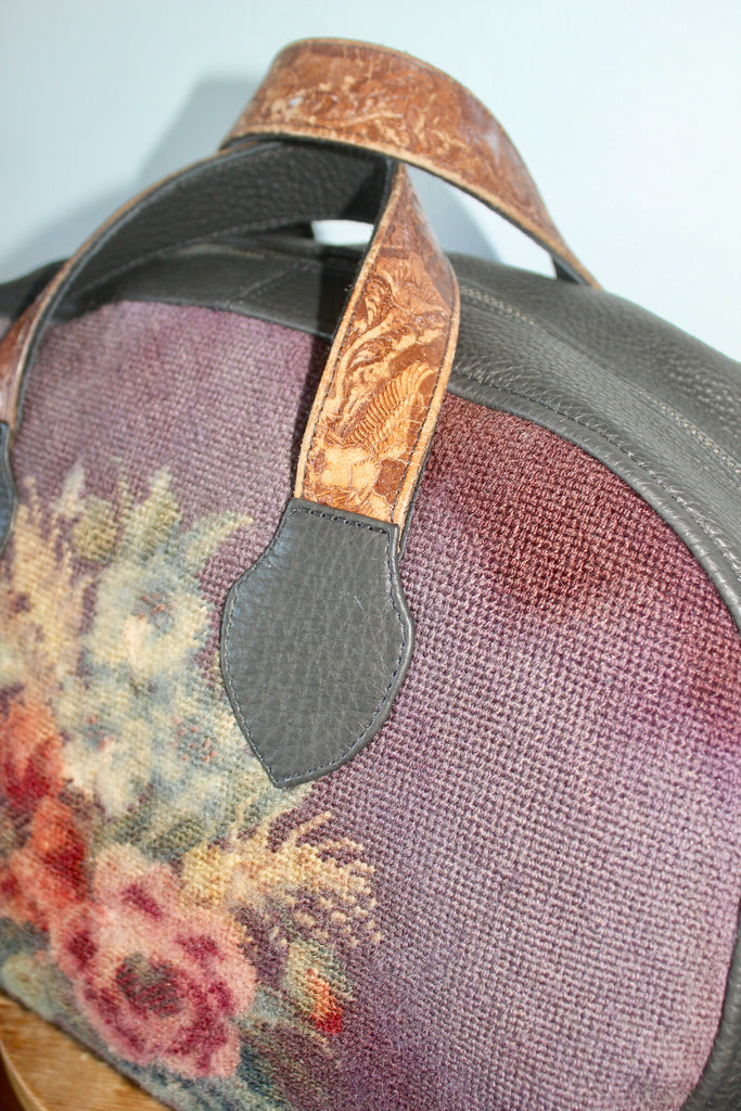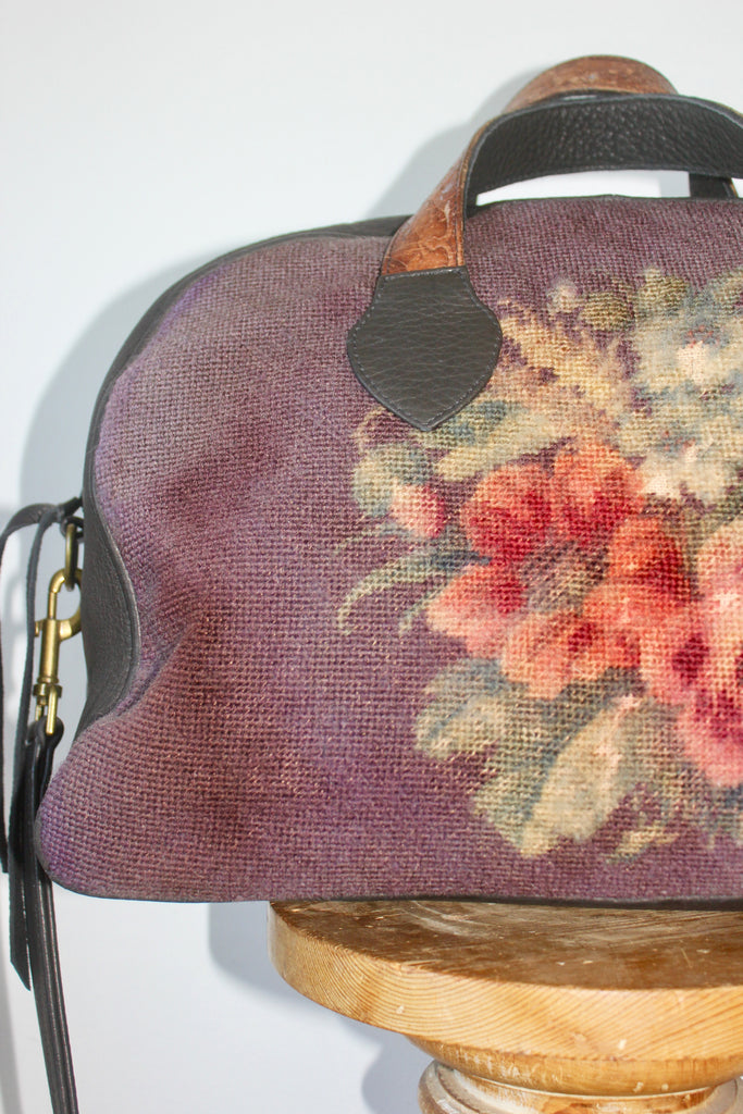 This specific Honeywood Overnighter Bag has a unique Smokey Lilac/Purple Floral Needlepoint and Black Elk Hide