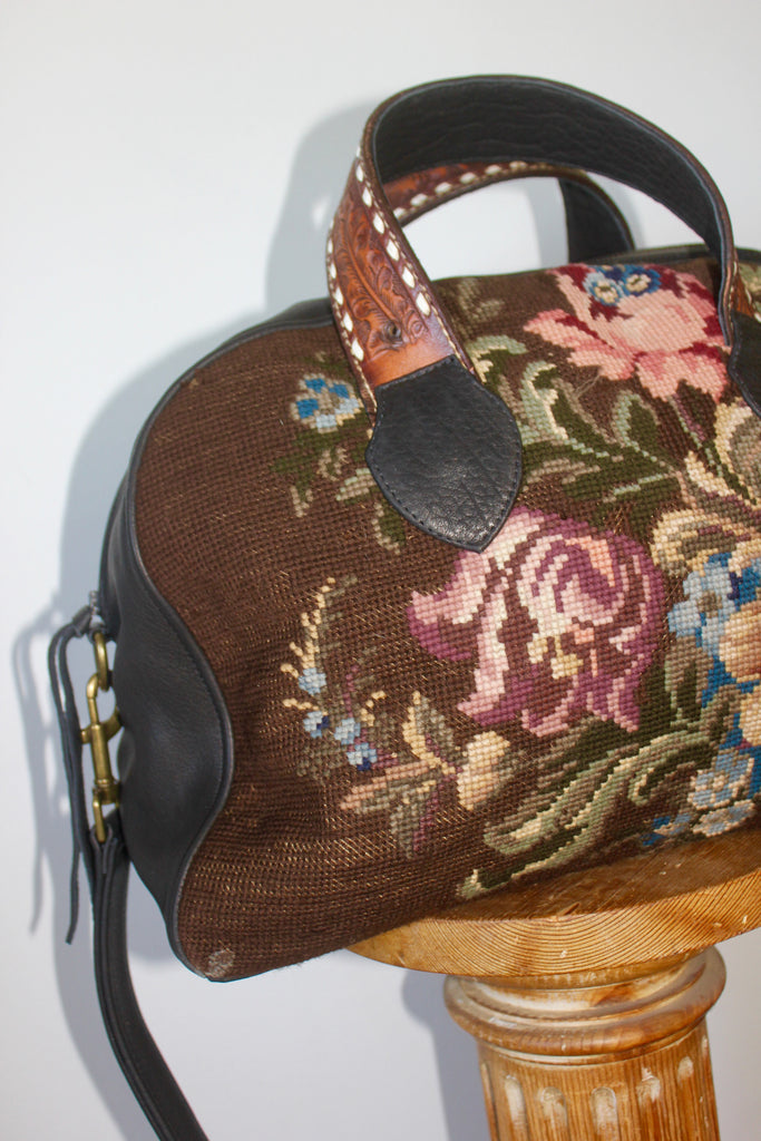Honeywood Original One of a Kind Handmade Overnighter Bag Antique Needlepoint and Elk