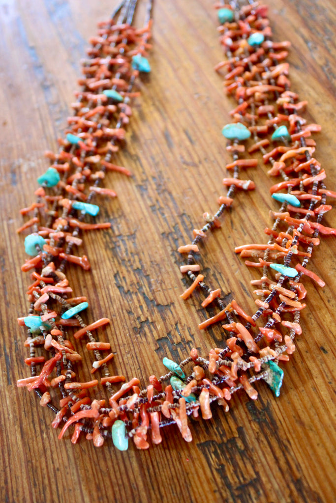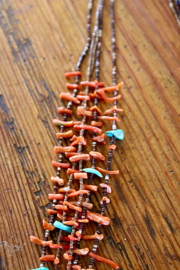 Old Pawn Navajo Made Five Strand Coral and Turquoise Necklace