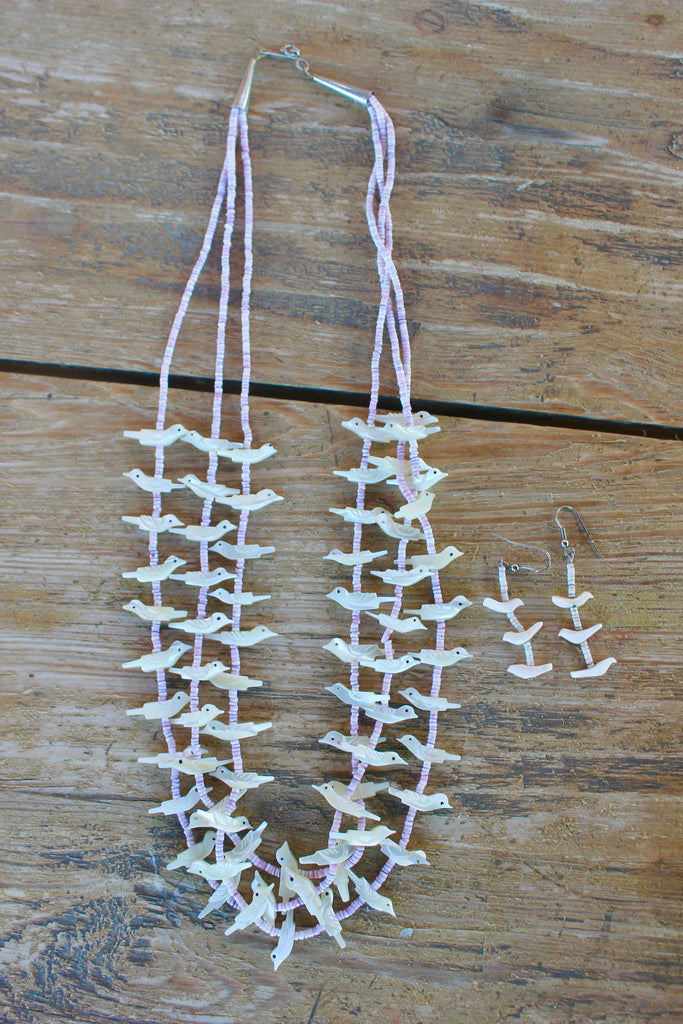 Vintage Zuni Shell Bird Fetish Necklace and earrings set