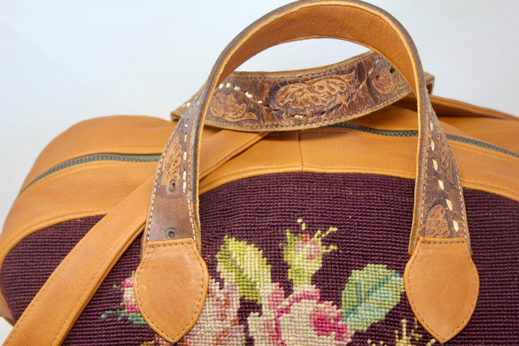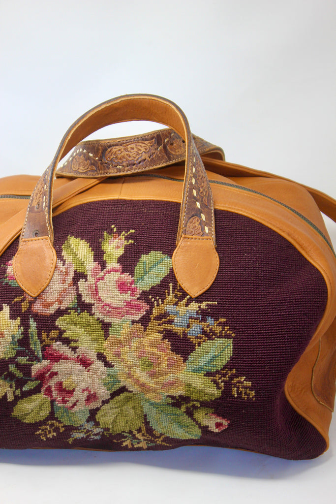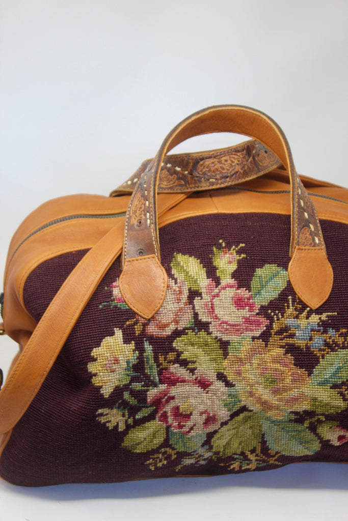 "Whiskey and Roses" Antique Needlepoint Handmade One of A Kind Honeywood Overnighter Bag